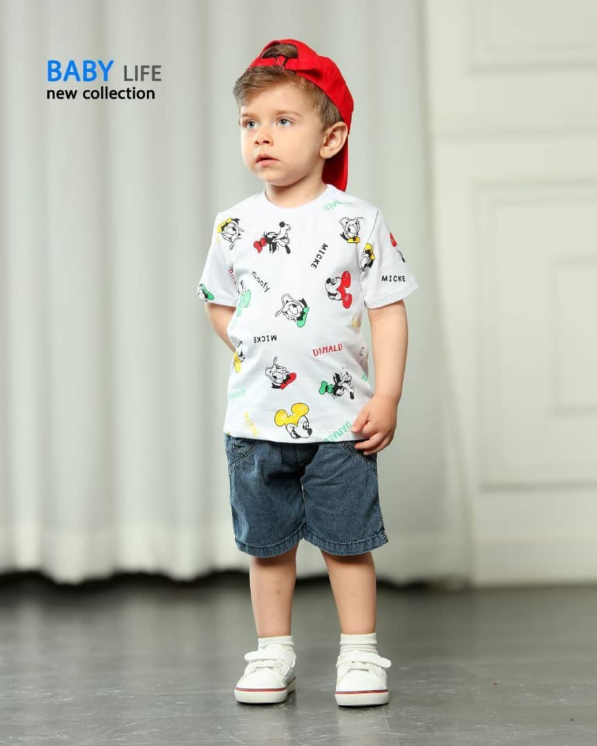 ست بلوز سفید طرح میکی و گوفی و شورت جین بی بی لایف